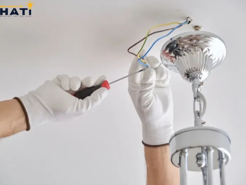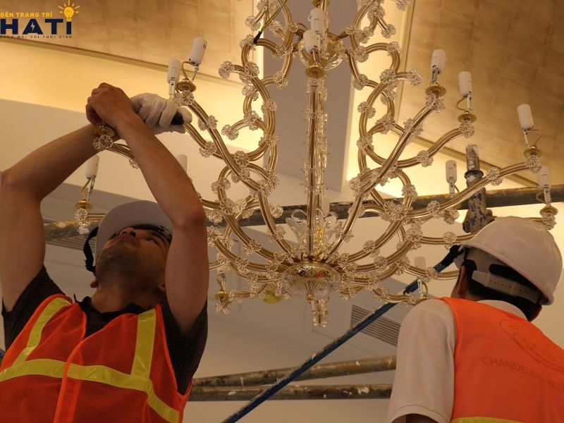 Đối với đèn chùm nặng, nên có hai người hỗ trợ, một người giữ đèn và một người thao tác siết ốc. Đảm bảo đèn thẳng đứng, không nghiêng lệch sau khi lắp.