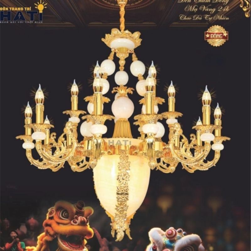 Đèn chùm đồng đá là loại đèn chùm được làm từ hai chất liệu chính là đồng và đá tự nhiên. Phần khung đèn thường được chế tác từ đồng, chao đèn sẽ được làm từ các loại đá như đá cẩm thạch, đá ngọc, hoặc các loại đá quý khác.