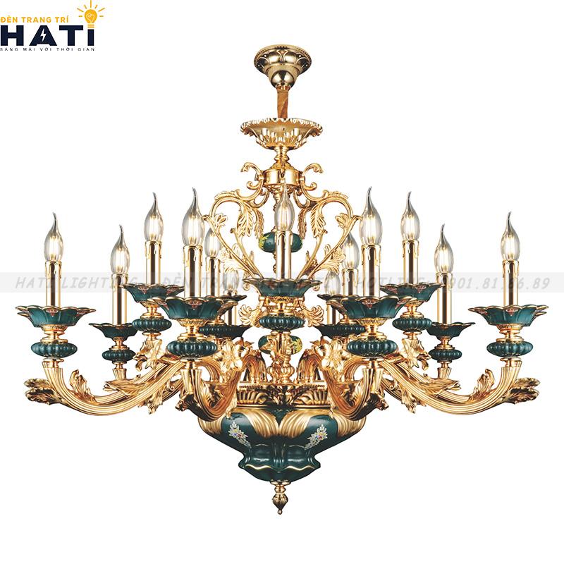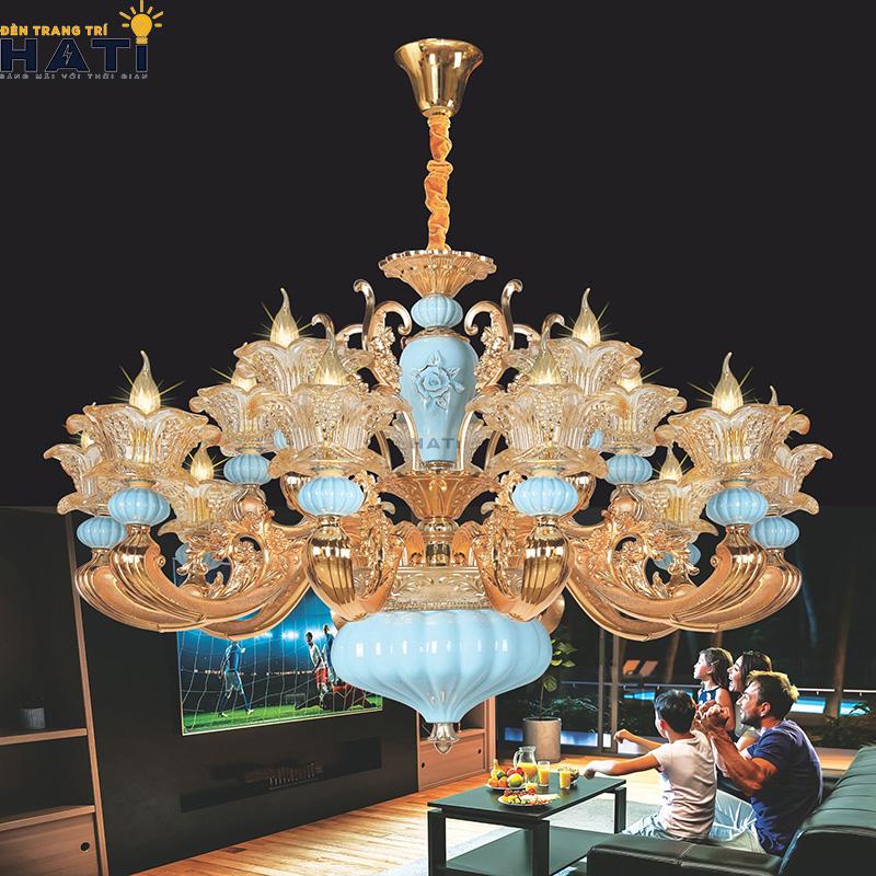 Mẫu đèn chùm cổ điển hình hoa cao cấp phối sứ xanh.