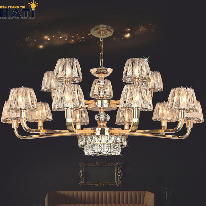 Mẫu đèn chùm 3 tầng cầu kỳ tạo điểm nhấn cho không gian ấn tượng.