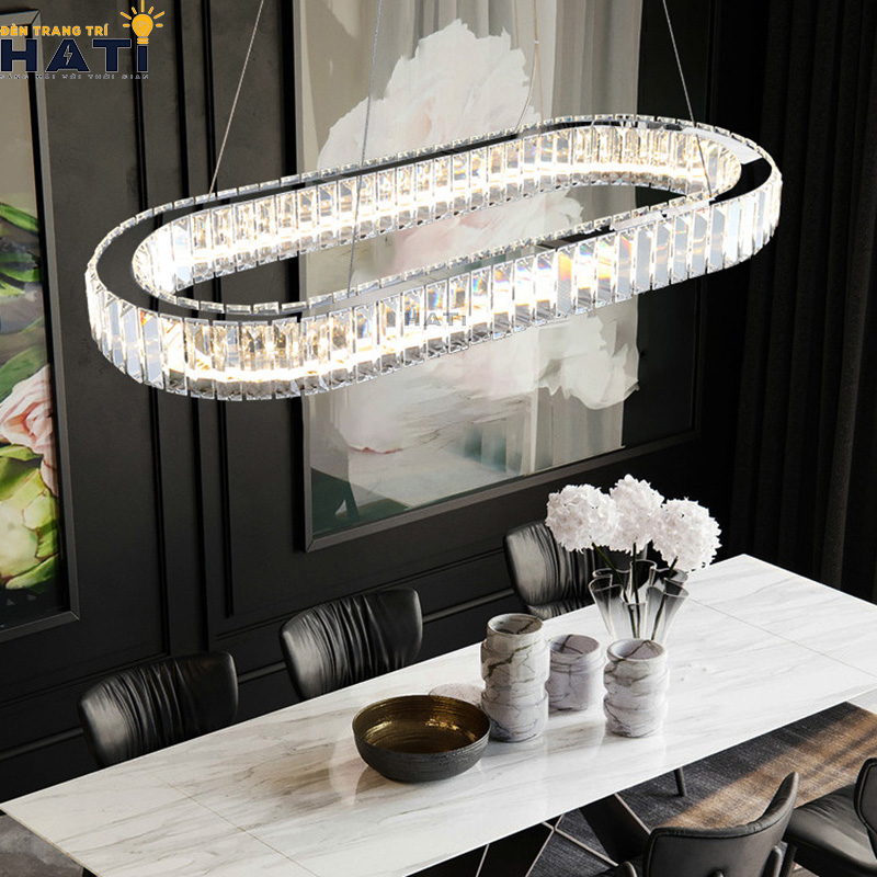 - Đối với các loại bàn ăn hình chữ nhật, hình bầu dục, các bạn nên lựa chọn những mẫu đèn thả dáng dài hoặc đèn chùm pha lê cỡ lớn để giúp cân bằng không gian.