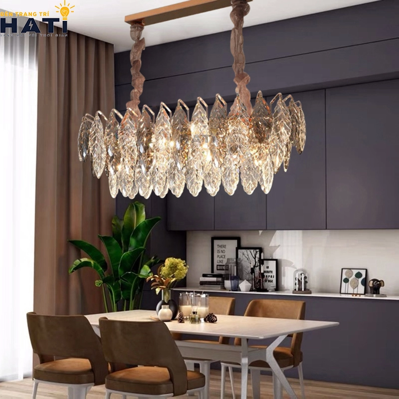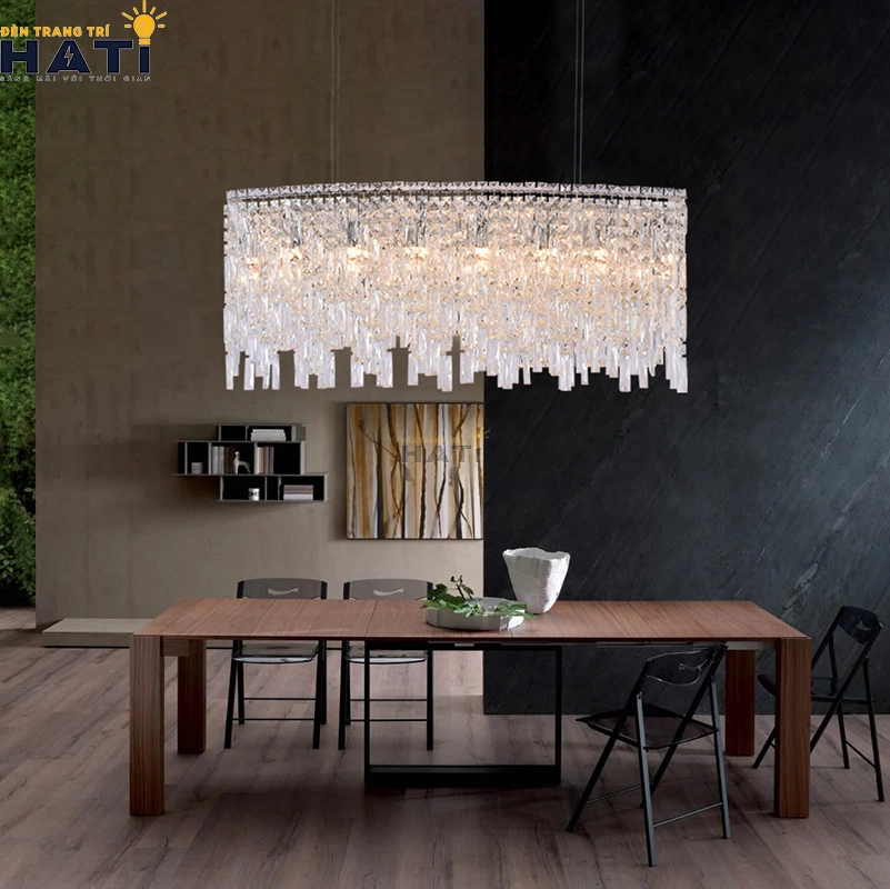 Đèn thả pha lê mang đến vẻ đẹp sang trọng và tinh tế cho phòng khách. Ánh sáng từ đèn pha lê có thể tạo ra những hiệu ứng lấp lánh, làm cho không gian trở nên lung linh và quý phái hơn.