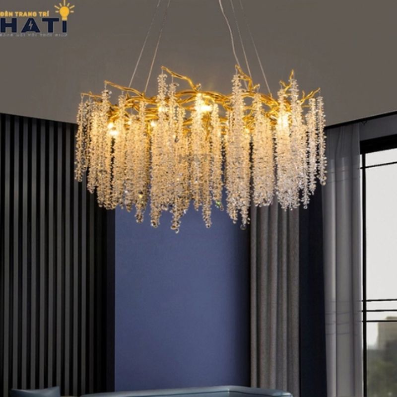 Đèn thả pha lê thường được kết hợp với khung kim loại mạ vàng hoặc mạ đồng, giúp tăng thêm vẻ đẹp quý phái và bền bỉ theo thời gian. Loại đèn này phù hợp với nhiều phong cách thiết kế từ cổ điển đến hiện đại.