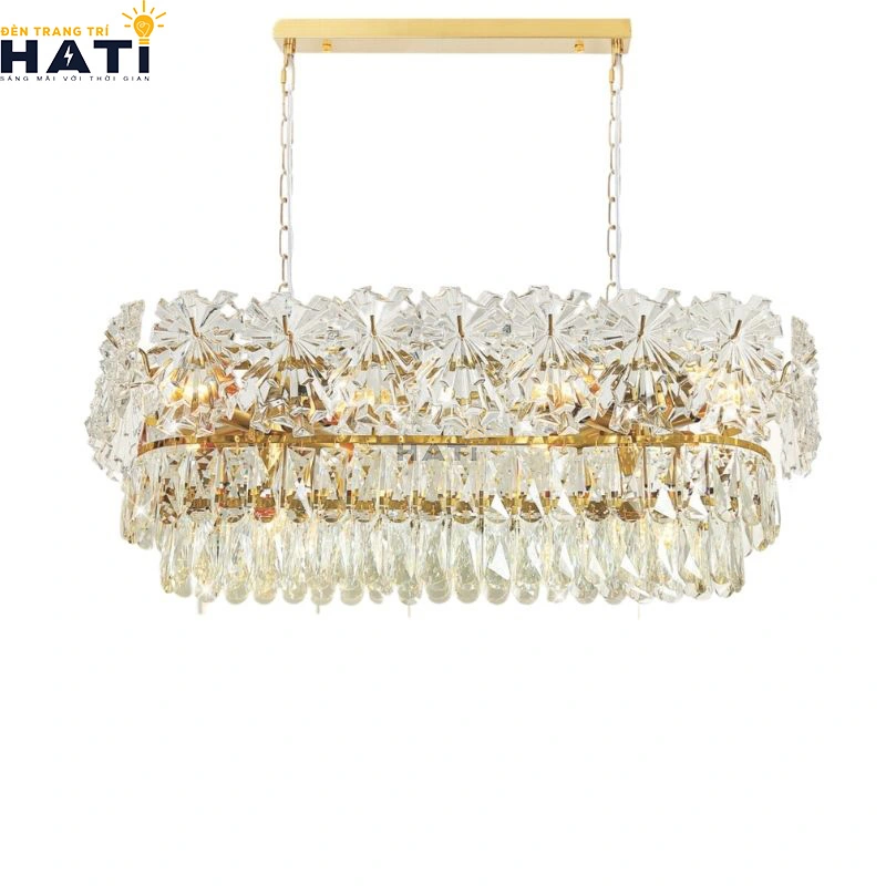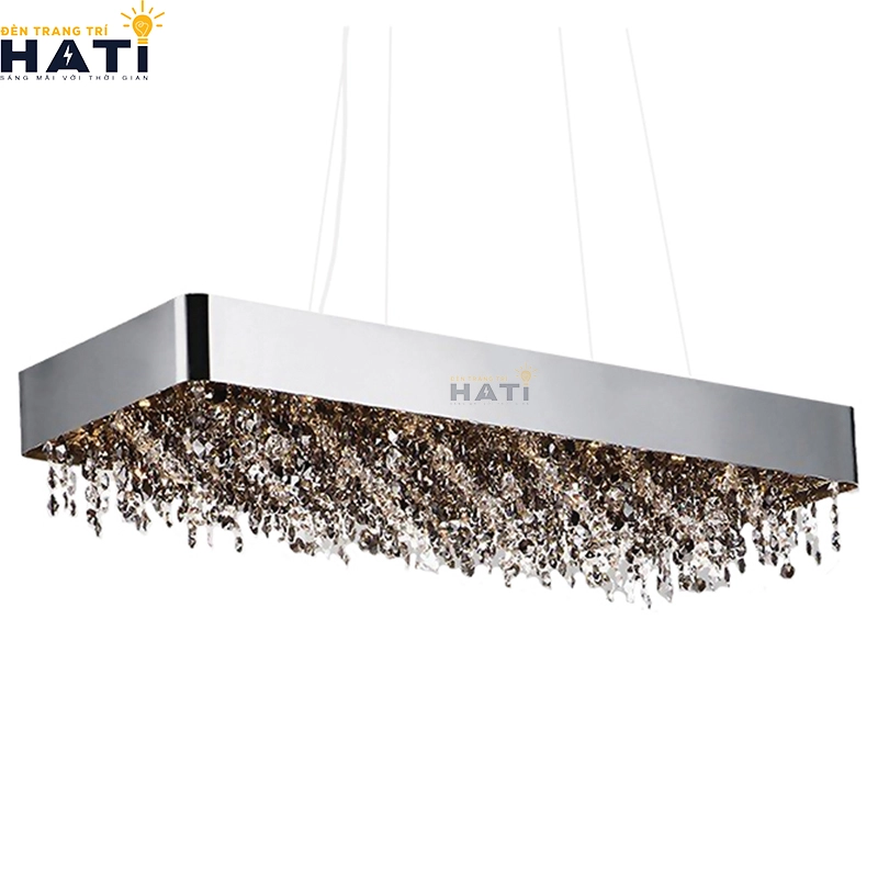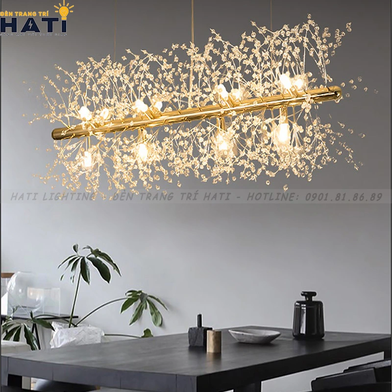 - Đèn thả pha lê: pha lê là chất liệu sang trọng, thường được dùng cho các mẫu đèn thả cao cấp. Giá của những chiếc đèn thả pha lê có thể rất cao, đặc biệt là các mẫu có kích thước lớn và thiết kế phức tạp.