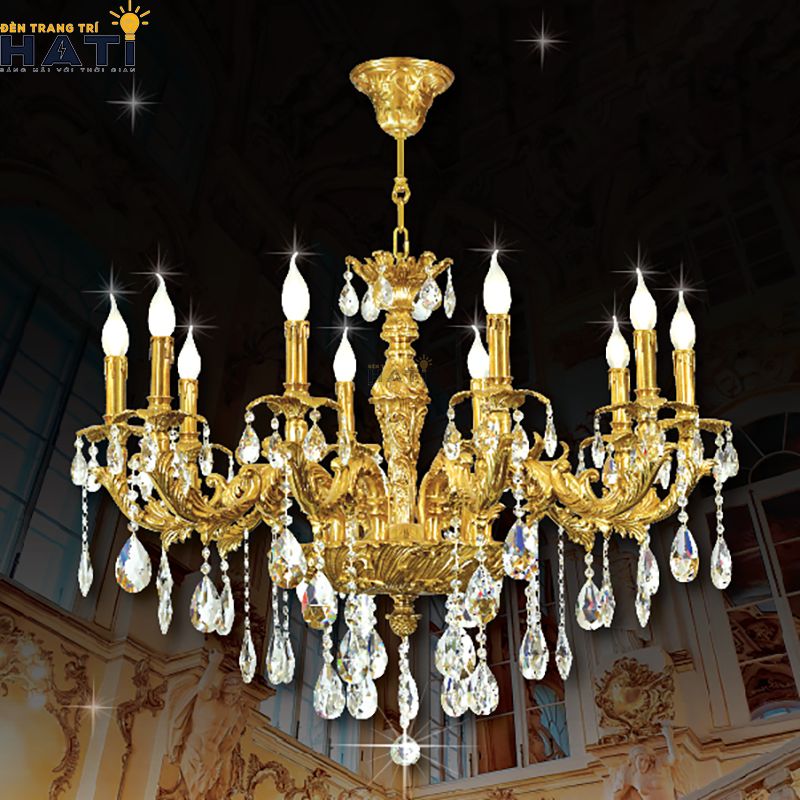 Nếu gia chủ là một người yêu thích phong cách cổ điển thì không thể bỏ qua đèn chùm đồng pha lê. Đây là sự kết hợp tinh tế giữa hai chất liệu cao cấp là đồng và pha lê, tạo nên một chiếc đèn sang trọng và lộng lẫy. Phần khung đèn được làm từ đồng với chi tiết hoa văn tinh xảo. mang đến vẻ đẹp cổ điển đầy quý phái. Kết hợp cùng các hạt pha lê sáng lấp lánh trở thành một điểm nhấn nổi bật trong không gian phòng.