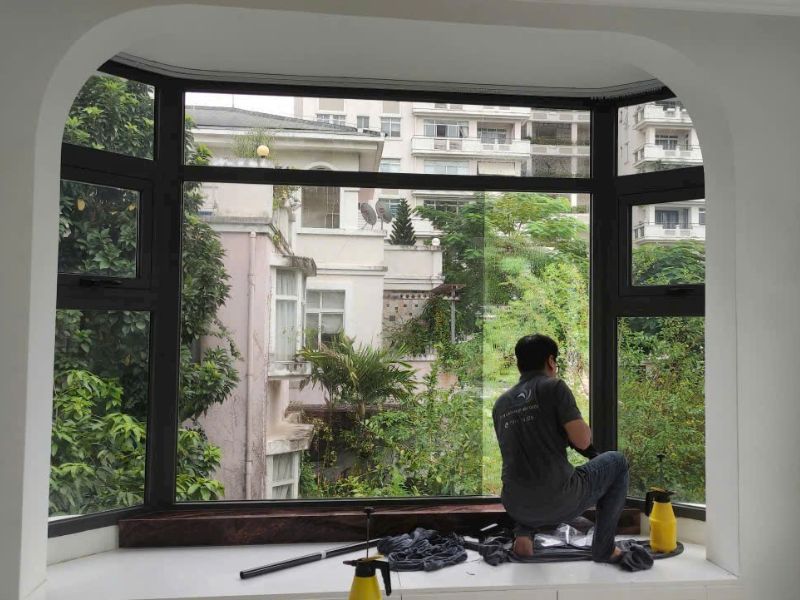 Bước quan trọng tiếp theo trong quy trình thi công dán phim cách nhiệt là vệ sinh bề mặt kính. Bề mặt kính cần phải sạch hoàn toàn để đảm bảo phim dính chắc chắn. Kỹ thuật viên sẽ sử dụng dung dịch làm sạch chuyên dụng để loại bỏ bụi bẩn, dầu mỡ và các tạp chất khác.